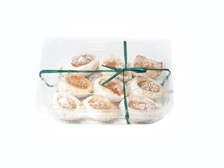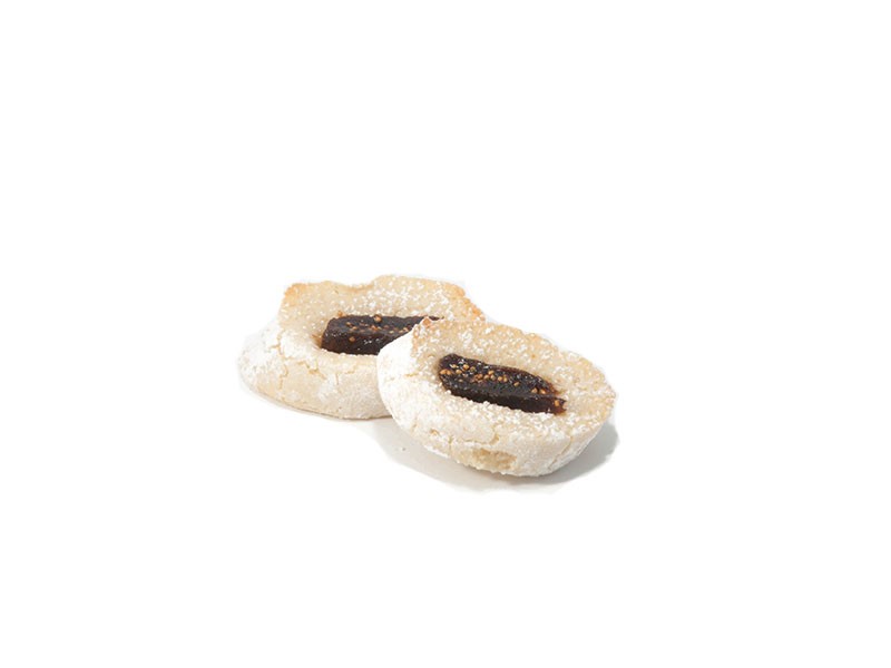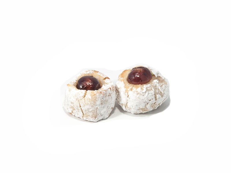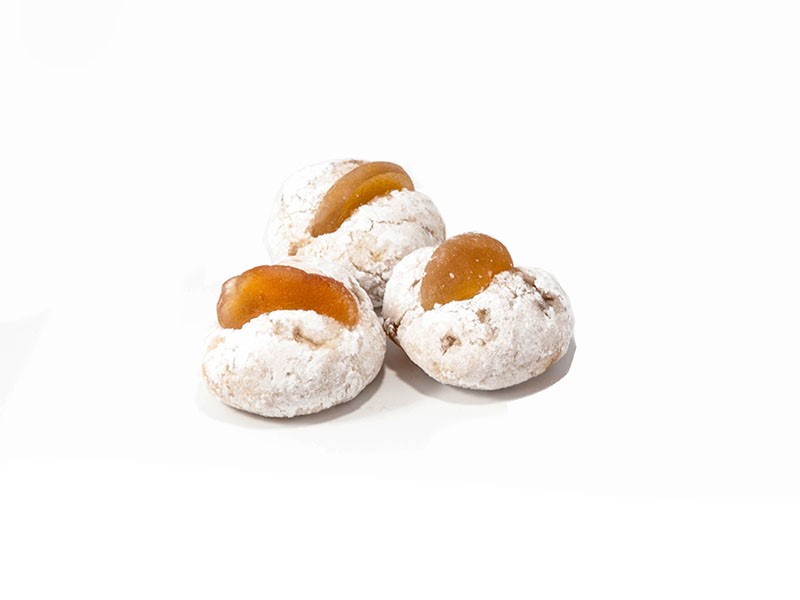 Morbido impasto di mandorle, impreziosito da uno spicchio di arancia candita e spolverati con dello zucchero semolato. Disponibili anche nella versione con le ciliegie candite e i fichi. Vendibile in confezioni da 300 g.
